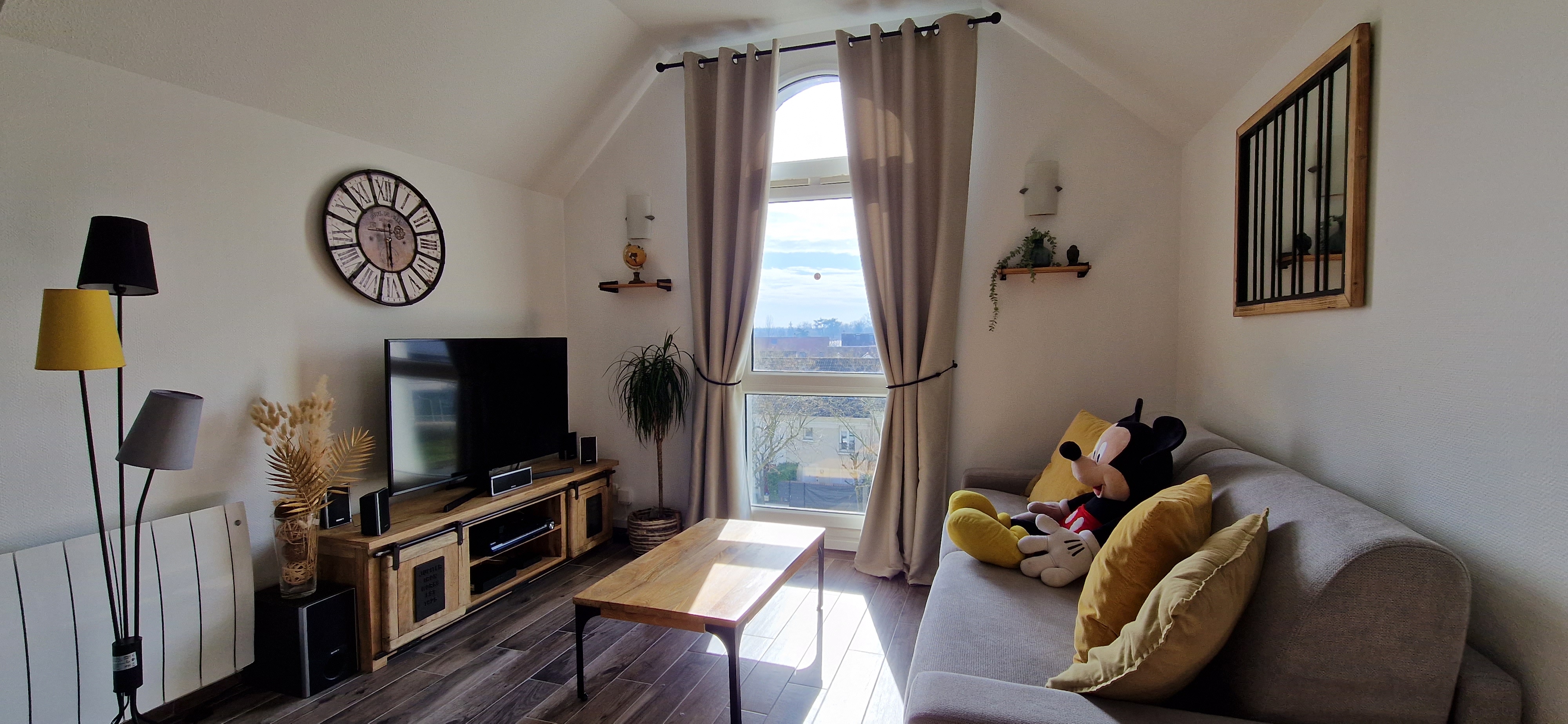 – D’un salon/séjour de 25m² équipé d’un canapé convertible (couchage permanant 160cm) et son espace détente Tv ainsi que sa cuisine à l’Américaine bien équipée (Four, micro-ondes, plaques inductions, matériels pour petit déjeuner, cafetitière TASSIMO, lave vaisselle, tous le nécessaires de cuisine, etc…).
